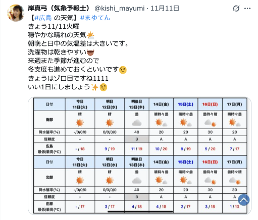 情報番組「イマナマ!」天気予報担当。ワイド番組、報道、ニュース、中継、ラジオで気象情報を伝える。2014年広島豪雨、2018年西日本豪雨では災害対応を経験。