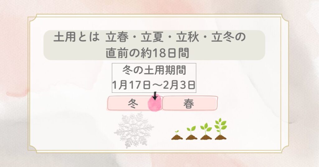 今年2026年の立春は2月4日なので、冬の土用は1月17日から2月3日になります。