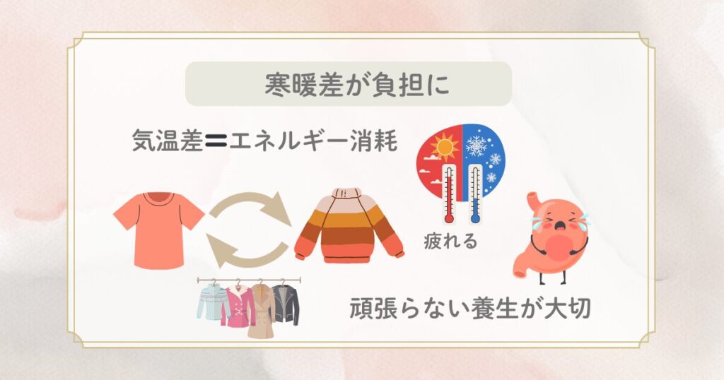 寒暖差があると体は体温を調整するだけでエネルギーを消耗します。私たちは意識しなくても体はずっと働きつづけているのです。