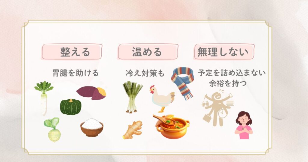 寒い時期ですので、「温める」ことも意識したいポイントです。